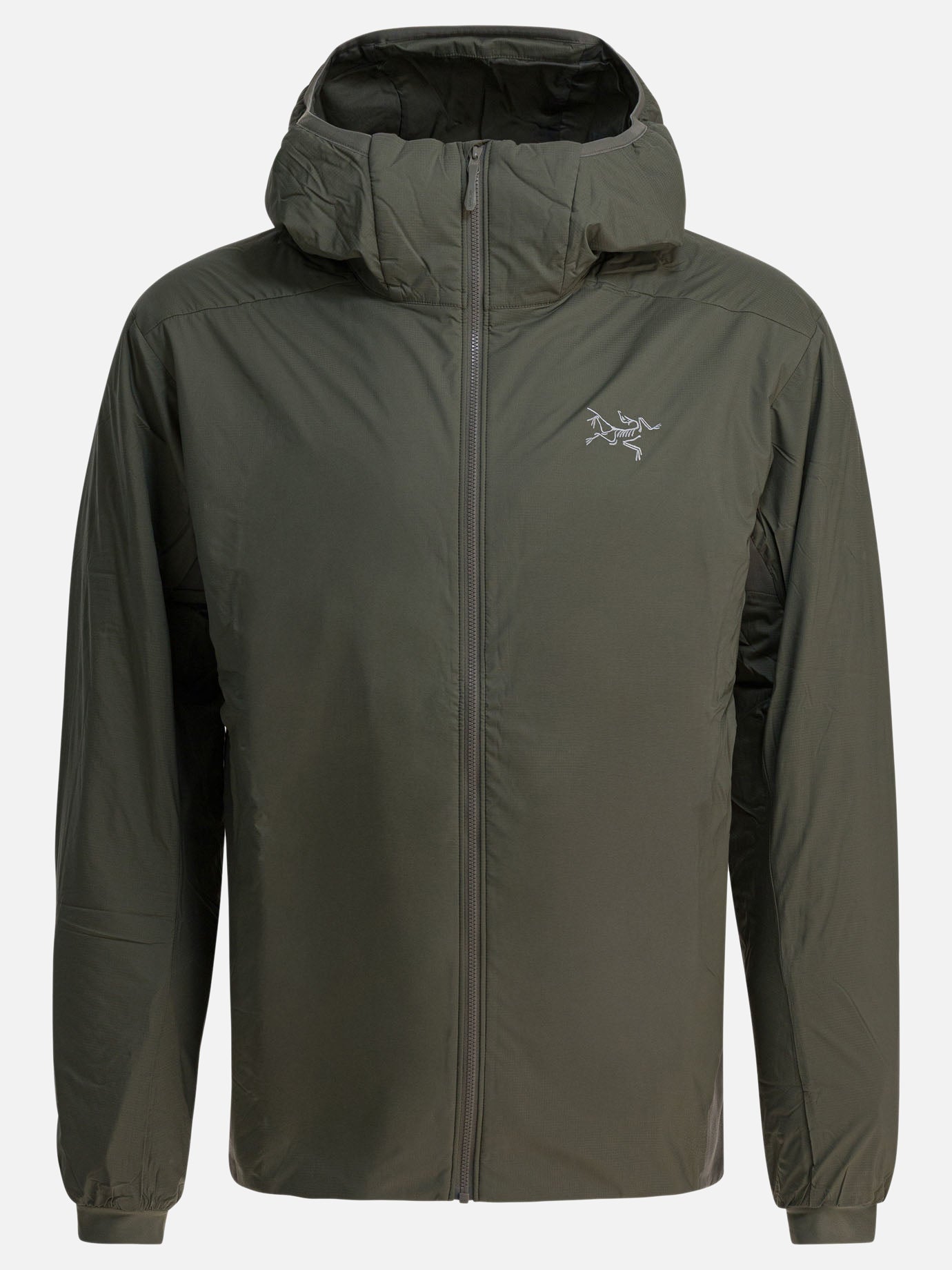 Arc'teryx "Atom Hoody" jacket with lightweight synthetic structure and regular silhouette, composed of air-permeable, moisture- and wind-resistant Tyono 20 fabric. Coreloft Compact 60 padding that maintains volume even when subjected to compression. Breathable stretch fleece side inserts, 20D recycled nylon inner lining and zipper closures. Integrated functional details including structured hood and lightweight seams.