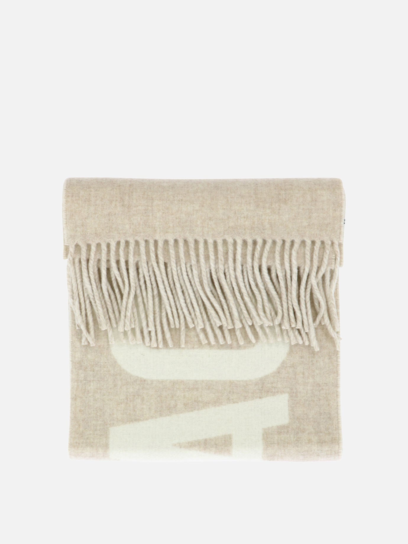 Jacquemus "L'Echarpe" scarf, made of plain-spun wool, features a soft texture and a linear rectangular silhouette. The Jacquemus logo is worked in jacquard within the weave, contributing to the textured look of the fabric. 12 cm bangs are applied on both ends, characterizing the finish. The construction results in no visible seams, maintaining a clean edge on both long sides.