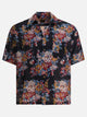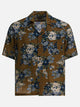 Kapital "Aloha" shirt made of silk and rayon-based fabric, with decorative Maria motif applied throughout. The construction features a soft, straight silhouette, characterized by a scooped collar stitched with regular topstitching. Tone-on-tone button front closure and slightly dropped shoulders. Cuff and side seam details are carefully finished for durability and straight construction.