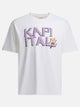 Kapital "Canoe Kapital" T-shirt features cotton construction, regular silhouette and ribbed crew neck. The front shows the KAP][TAL logo print, inspired by the leather labels on Kapital jeans. The print, composed of distinctive graphic characters, includes an outward-facing parenthesis and a stylized "L" to resemble a canoe, details that contribute to the garment's visual identity. Uniform surface finishing.