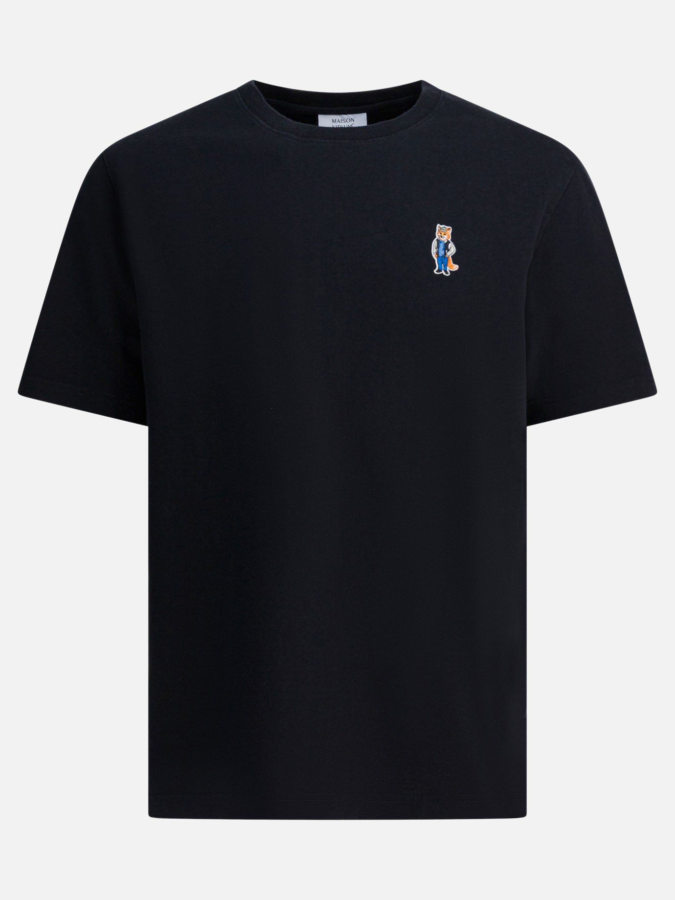 Maison Kitsuné "Dressed Fox" T-shirt with linear construction in organic cotton. Soft structure and silhouette with relaxed fit. Round neck finished with ribbed work. On chest, embroidered patch applique with representation of Dressed Fox motif. Natural fabric offers lightness and regular structure, with no extra inserts or cuts.