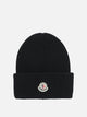 Moncler cashmere and wool cap, constructed of heavy knit with brioche stitch work. The 3-fine structure defines a soft, enveloping silhouette. The yarn, composed of a virgin wool and cashmere blend, provides thermal insulation and uniform texture. A front-applied felt logo patch identifies the product. Perfect for men and women, with stretch edging for a stable fit.