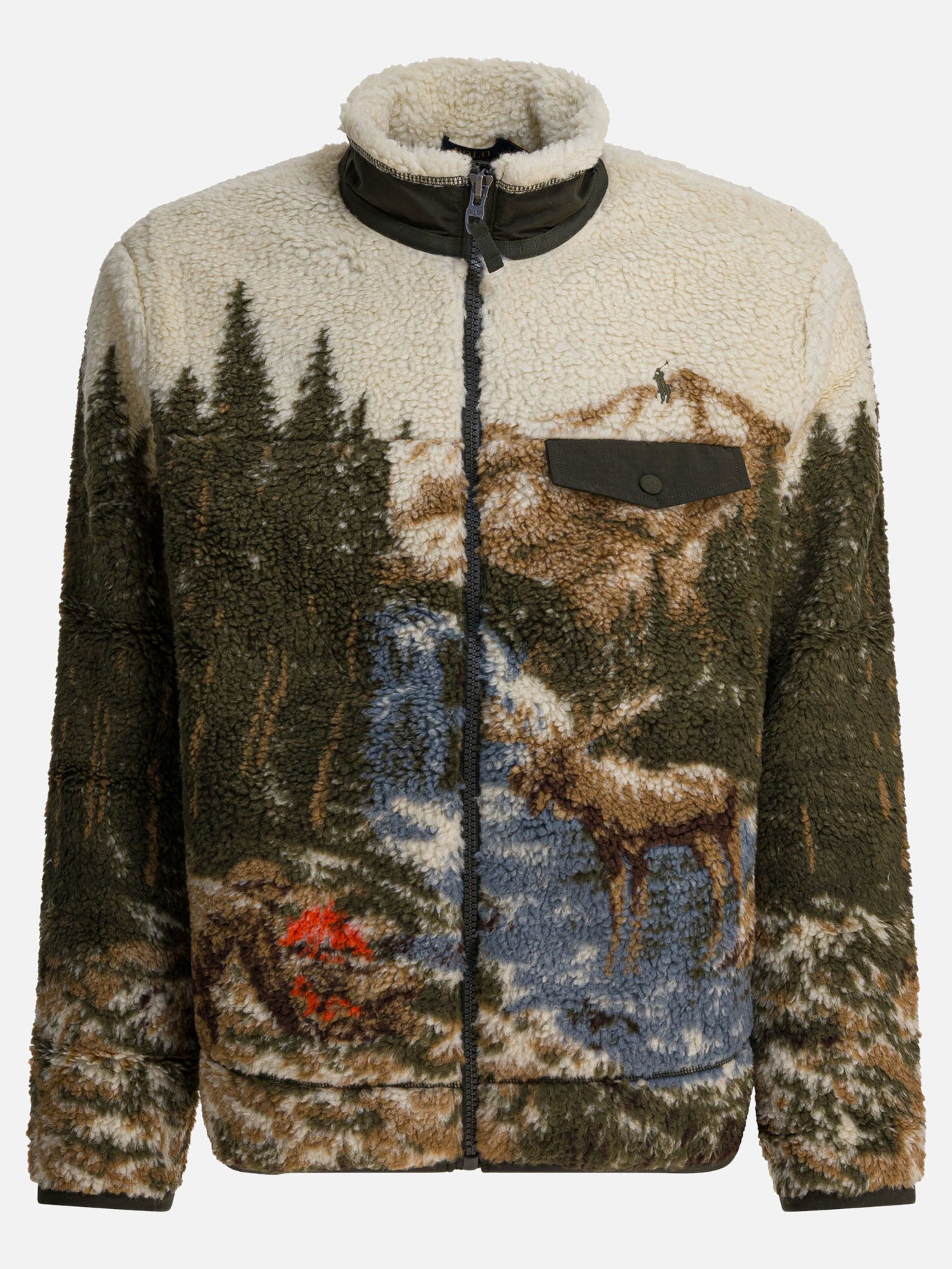 Polo Ralph Lauren "Scenic" fleece jacket features long pile construction coupled with brushed short pile interior. Mock neck construction with ripstop insert extending to front zipper closure. Straight silhouette with long sleeves, stretch edging on cuffs and bottom hem. Garment features flap pocket with snap on chest, two front zipper pockets and distinctive pony embroidery on chest.