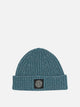 Stone Island mouliné wool cap, made with mouliné yarn at fineness 3. The structure features a fitted silhouette, with ribbed lapels positioned at the bottom. The workmanship highlights the irregular texture of the fabric, while the Compass logo patch applied on the front defines its identity. The pattern maintains a compact construction, promoting uniform fit and coverage.
