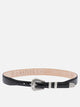 Adriano Meneghetti leather "Palladium" belt, constructed of full-grain crocodile-printed calfskin. The silhouette maintains a linear and rigid structure, with sharp profiles and uniform thickness. The strap is articulated in a continuous, regular band, interrupted by the rectangular solid brass buckle with English silver plating, integrated through a hand-sewn loop. The surface features a raised, crocodile-effect texture.