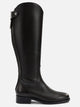 Aeyde's "Hector" boots, featuring a full-grain leather upper and structured construction, reinterpret the classic riding boot shape with an elongated, fitted silhouette. A rounded toe defines the front profile. Logo press studs positioned at the top facilitate side closure. The fit follows essential lines and stands out for the smooth surface without ornamental stitching.