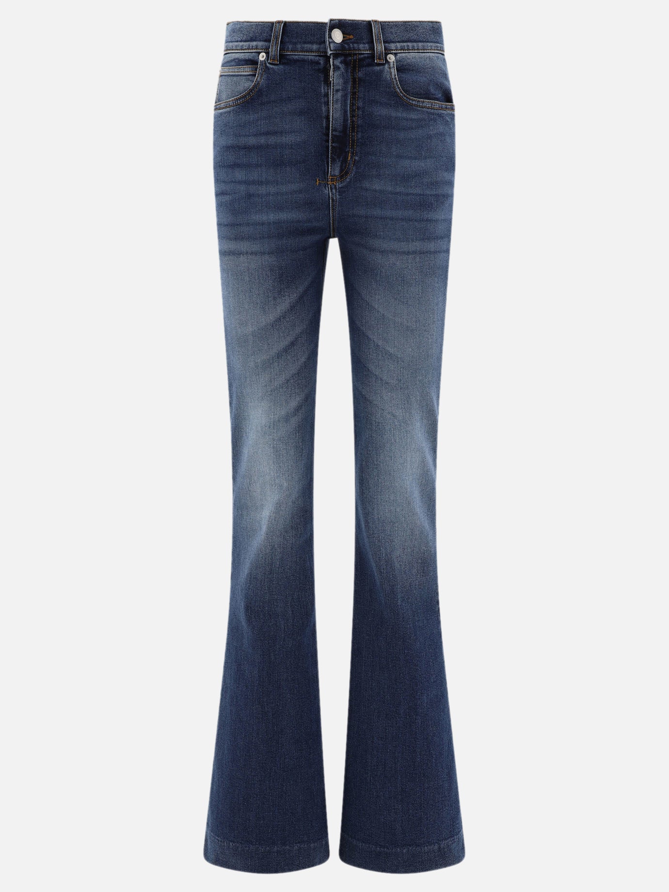 Alexander McQueen's bootcut jeans are a must-have for any woman who wants a sophisticated, contemporary look. Made of dark blue washed stretch denim, these jeans feature a comfort fit and a design that enhances the feminine silhouette. Contrasting topstitching adds a distinctive touch, ideal for those looking for a versatile, high-fashion garment.