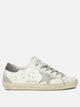 Golden Goose "Super-Star" sneaker, smooth leather construction and suede inserts, exposed stitching and regular silhouette. Closure with logoed cotton laces, side star with glitter finish applied to upper. Back heel finished with glitter detail, suede tongue. 2 cm thick rubber sole features wear effect and logo finish. Leather-lined interior for added comfort and support.