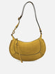 Isabel Marant small "Oskan Moon" shoulder bag with semi-rigid structure, made of woven suede calfskin. The silhouette is rounded with a profile finished with a woven leather trim. Equipped with an adjustable wide shoulder strap, the bag's construction integrates a top metal zipper closure, embellished with long knotted leather slider. Metallic elements engrave the brand name at the front.