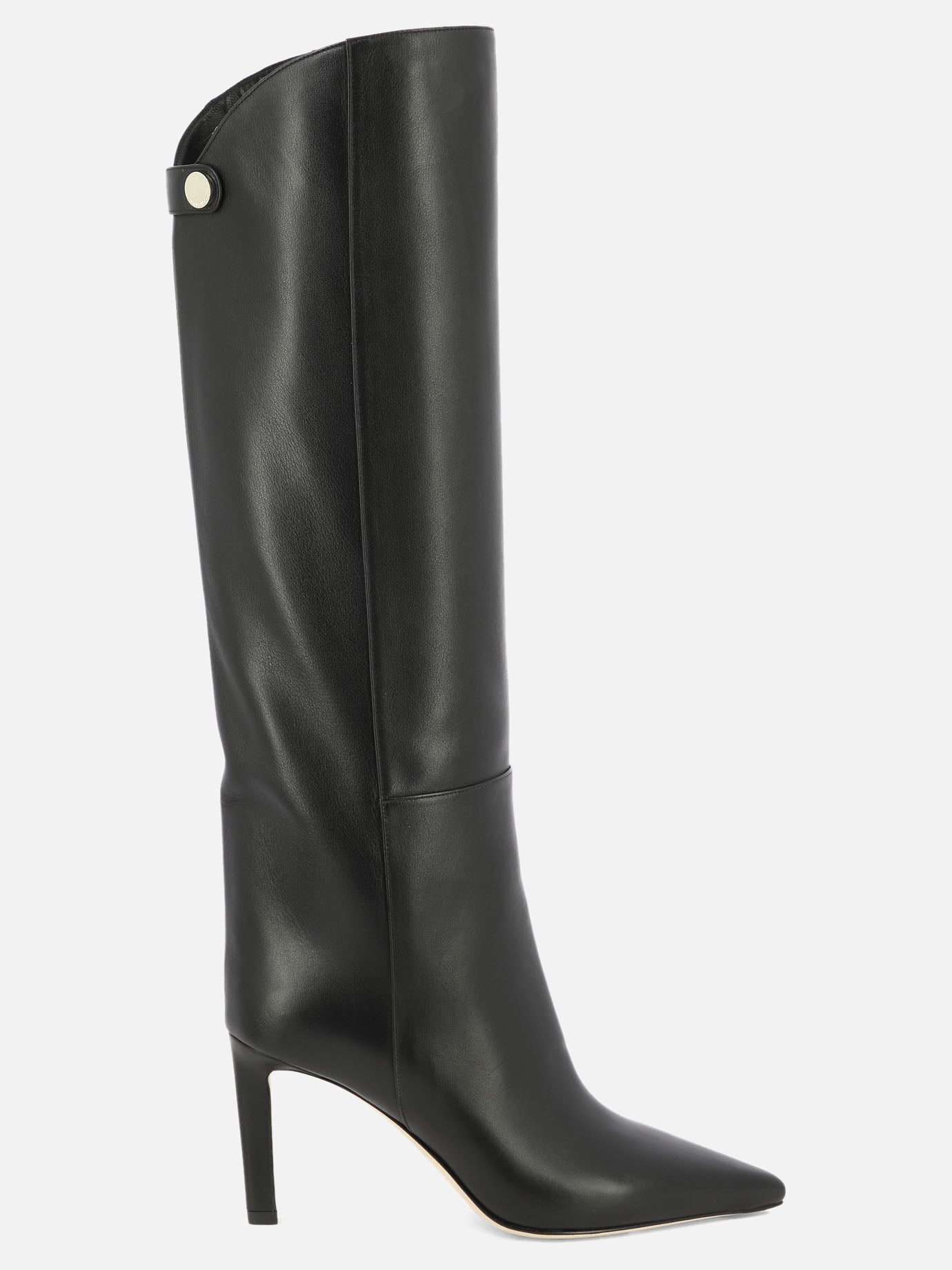 Jimmy Choo's 85mm "Alizze" boots made of smooth leather with a riding-inspired silhouette. Tube structure with tapered line and defined toe. Integrated slim heel and strap closure at the back. Solid construction with selected materials and upper component that extends above the ankle for a compact, linear profile. Uniform workmanship and functional details without additional embellishments.