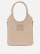 Miu Miu "Ivy" handbag, made of calfskin leather with a surface characterized by a uniform luster and soft touch. The structure features a compact geometric silhouette with a top opening and double leather handles. The interior construction features a main compartment finished in cotton gabardine, equipped with a patch pocket. Golden metallic finishes and front lettering logo applied on leather insert complete the model.