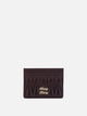 Miu Miu matelassé nappa leather card holder, constructed of matelassé-effect worked leather with a compact silhouette and simple lines. The structure integrates six card slots, organized in parallel rows, designed to distinguish and hold essential cards and documents. The outer surface features a vertical metal lettering logo applied in relief. The interior is finished with moiré lining, chosen for strength and uniformity.