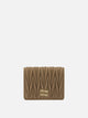 Miu Miu matelassé nappa leather wallet, constructed from leather worked with a three-dimensional pattern, features a compact silhouette and rigid structure. The product integrates a snap-button closure, finished edges and embossed lettering logo applied on the surface. The interior is organized with multiplicity of compartments designed to accommodate banknotes, cards and coins. The interior lining is made of moiré fabric.