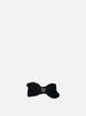 Miu Miu velvet bow clasp, constructed with a rigid velvet-covered base, features a stable structure and a silhouette defined by the voluminous profile of the bow. The main body combines a soft texture with the metallic element of contrasting lettering logo applied on one end. It is secured by an internal mechanism built into the structure, designed to ensure a stable hold on the hair.