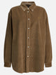 Miu Miu logo velvet shirt, regular-weave corduroy construction inspired by men's wardrobe. Construction features soft lines, straight silhouette and relaxed fit. Defined shirt collar, garment has no inner lining, front buttons and button-fastening cuffs. Functional details such as patches and suede lettering logo add recognizable elements to the design.