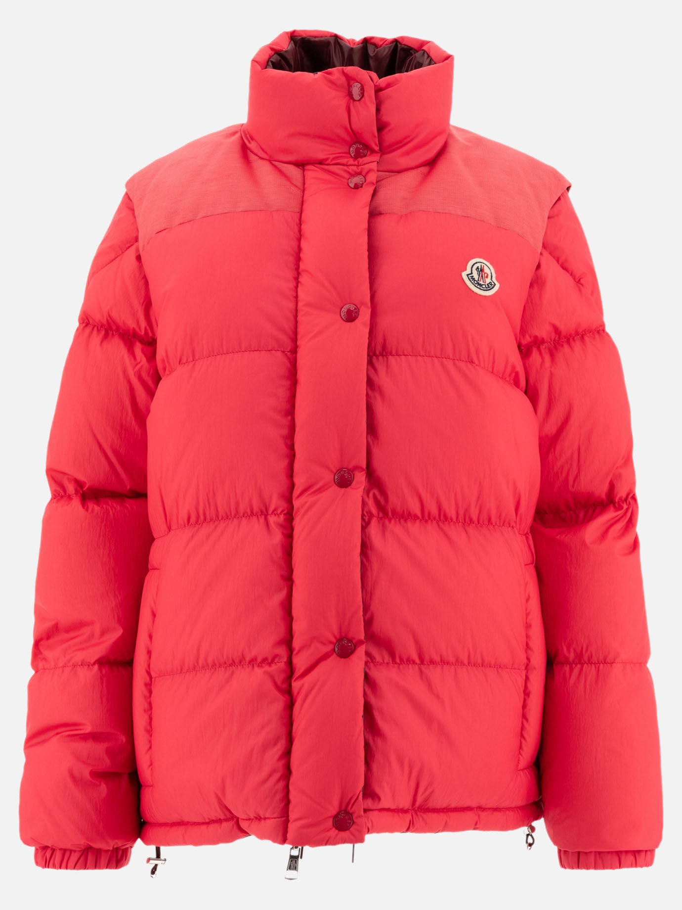The Moncler "Verone" reversible down jacket is a contemporary reinterpretation of the classic 1980s down jacket. This cutting-edge model is transformable thanks to its removable sleeves, which also allow it to be worn as a vest. The shiny polyester side and the tear-resistant nylon side with a matte finish offer two distinct looks, complemented by the canvas logo and adjustable drawstring at the waist and bottom.