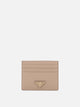 Prada Saffiano leather card holder made with micro-weave engraved texture. The compact structure features clean lines and raw-cut finished edges. Six card slots are integrated on both sides, complemented by a central interior pocket. The Prada logo on enameled metal triangle, applied on the surface, signals the brand's identity. The interior lining pairs moiré and Saffiano leather for added durability.